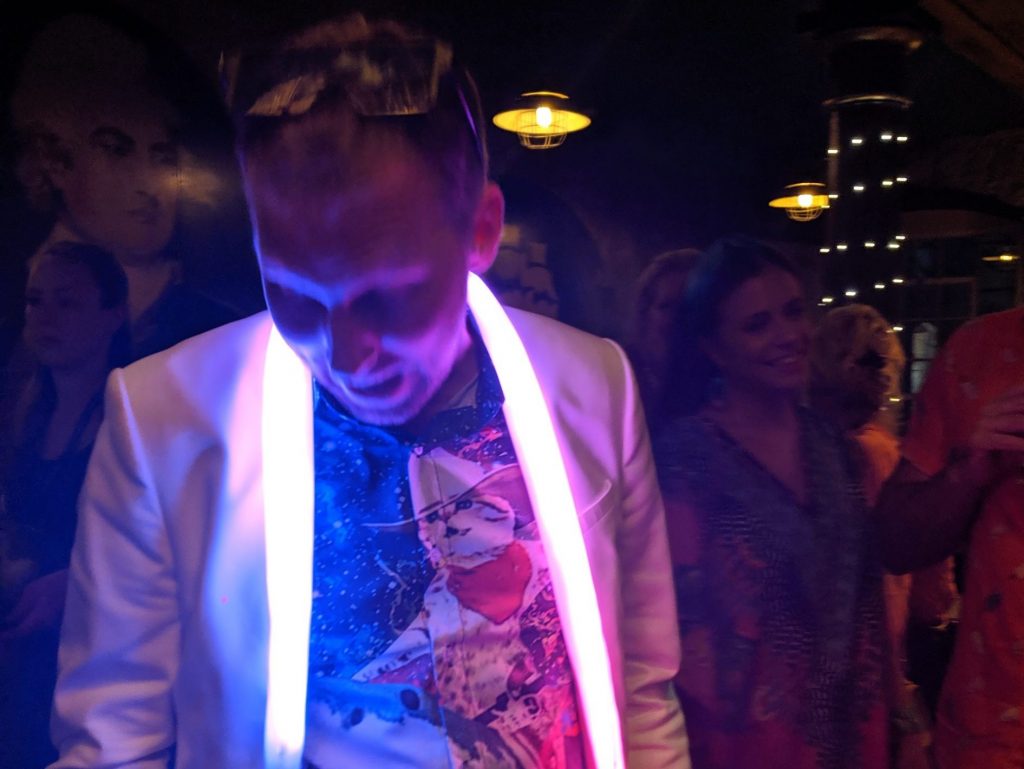 Created especially for our dress-up wedding party with my wonderful wife Becky Dodman Wainwright. This white jacket had over 400 addressable LED’s sewn into the lining and was controllable by WiFi by anyone that I let access it. It turned out that the person I trusted to control my jacket took advantage of the privilege and promptly blinded everyone by pushing the brightness to max…